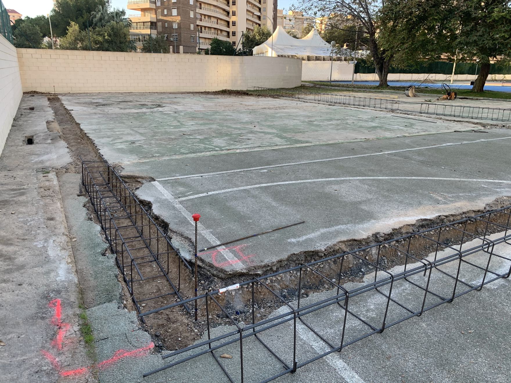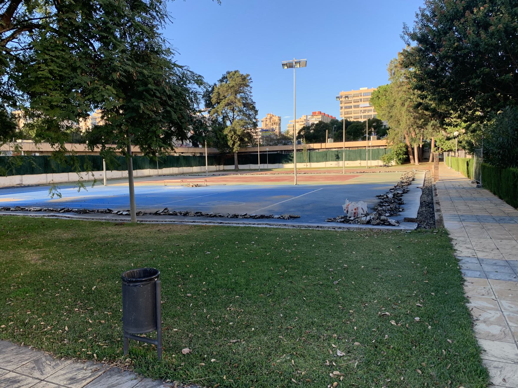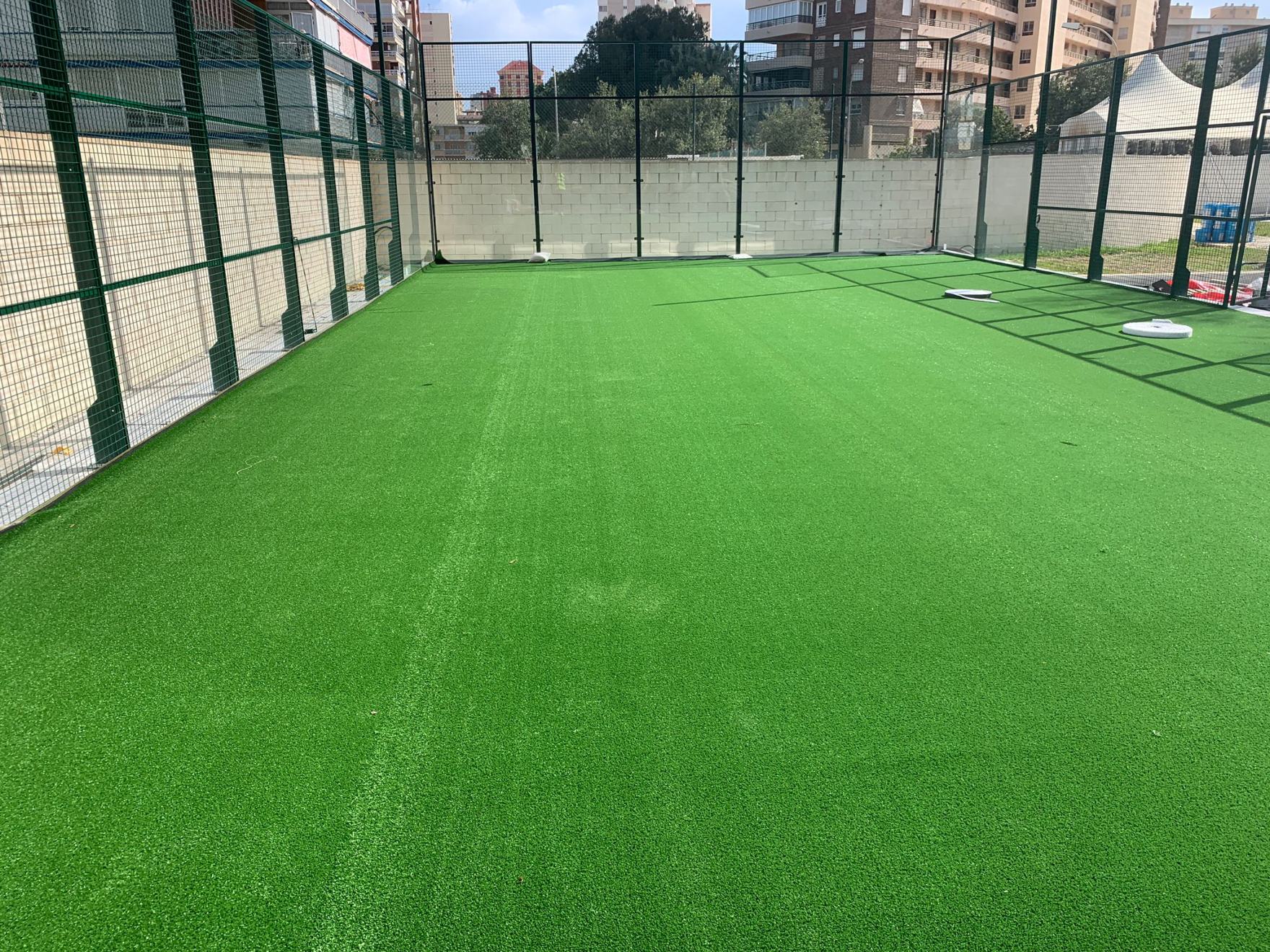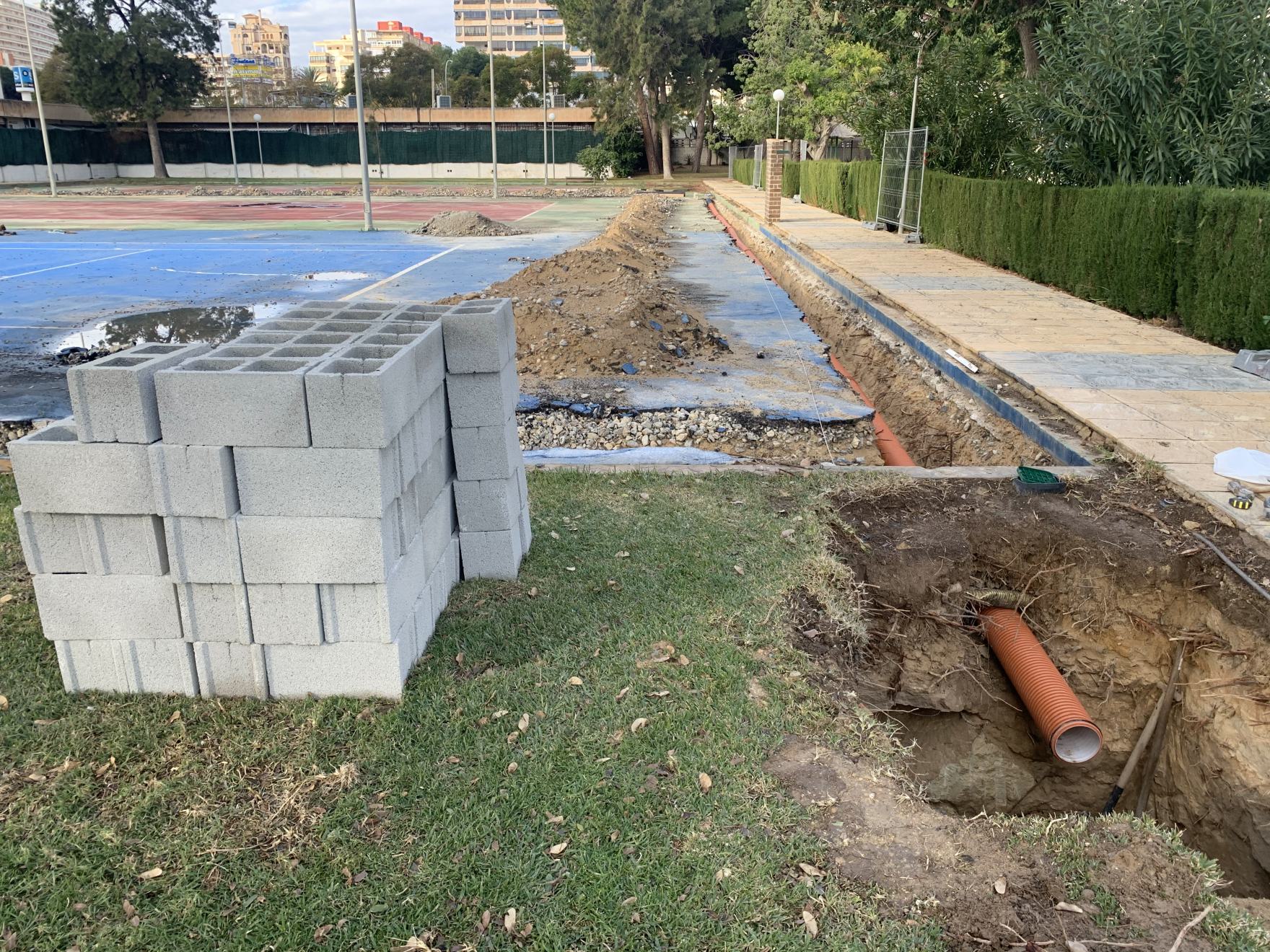 Se trata de 3 pistas llave en mano y se precedió a su completa demolición para posteriormente renovar el sistema de recogida de aguas pluviales, asfaltar la base con 2 capas de mezcla bituminosa en caliente sobre zahorras, sistema de resinas de 4 capas, equipamiento de tenis y vallado perimetral. La pista de pádel está montada sobre una nueva solera de hormigón, estructura lacada en verde, cristales templados de 10 mm, césped fibrilado de 10 mm de alta calidad y 8 focos led de bajo consumo.