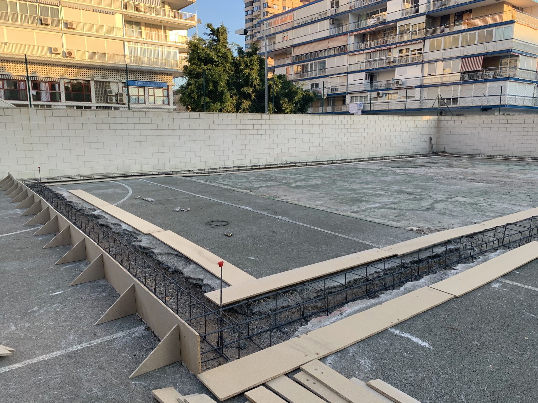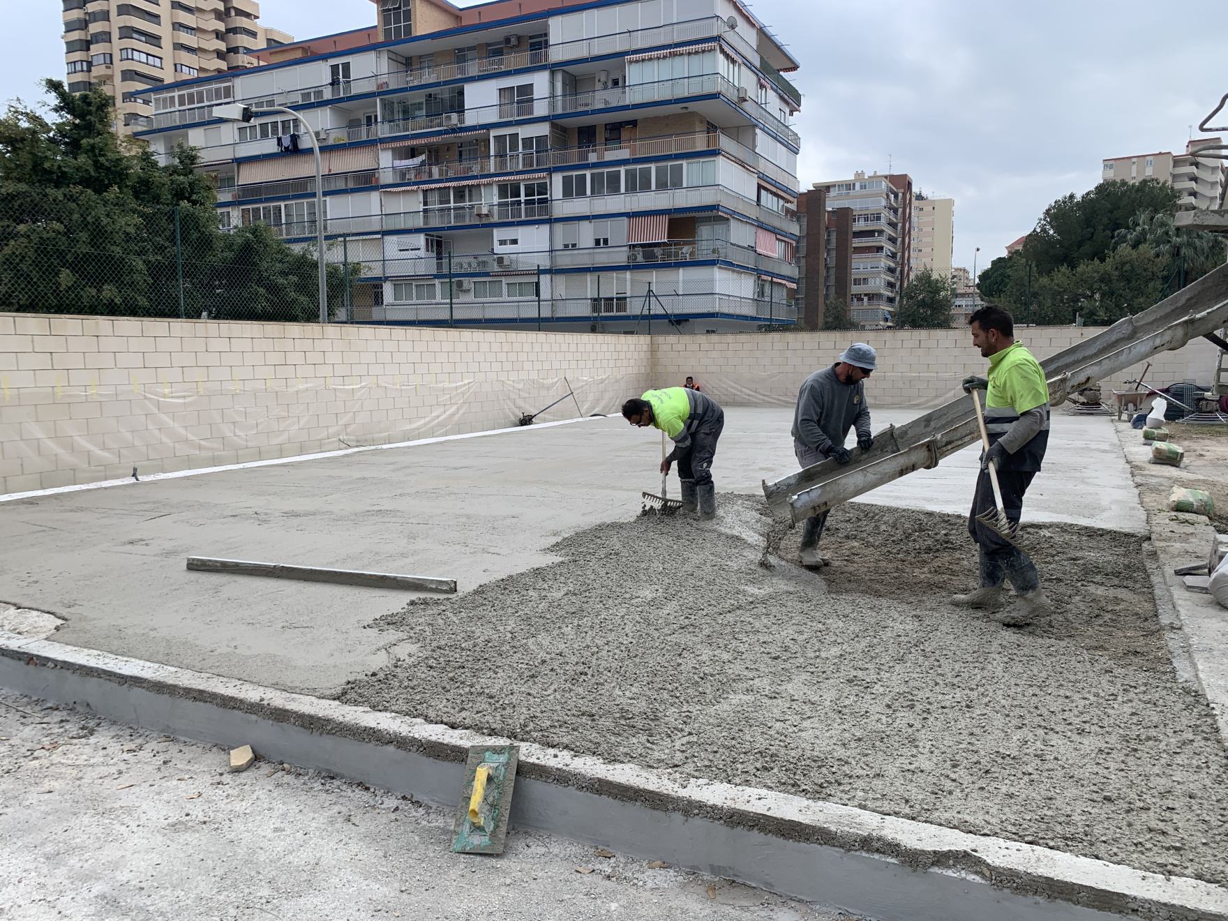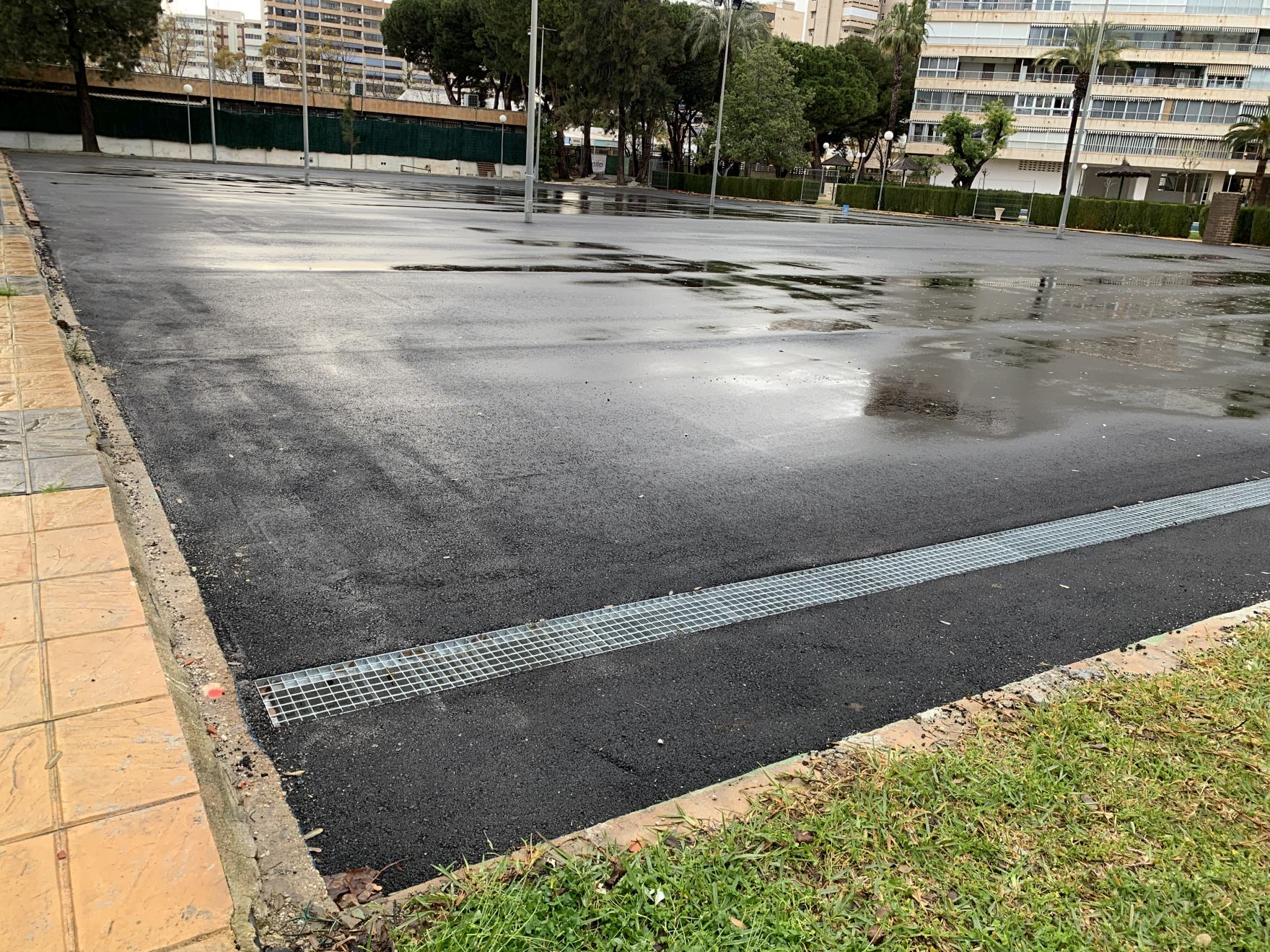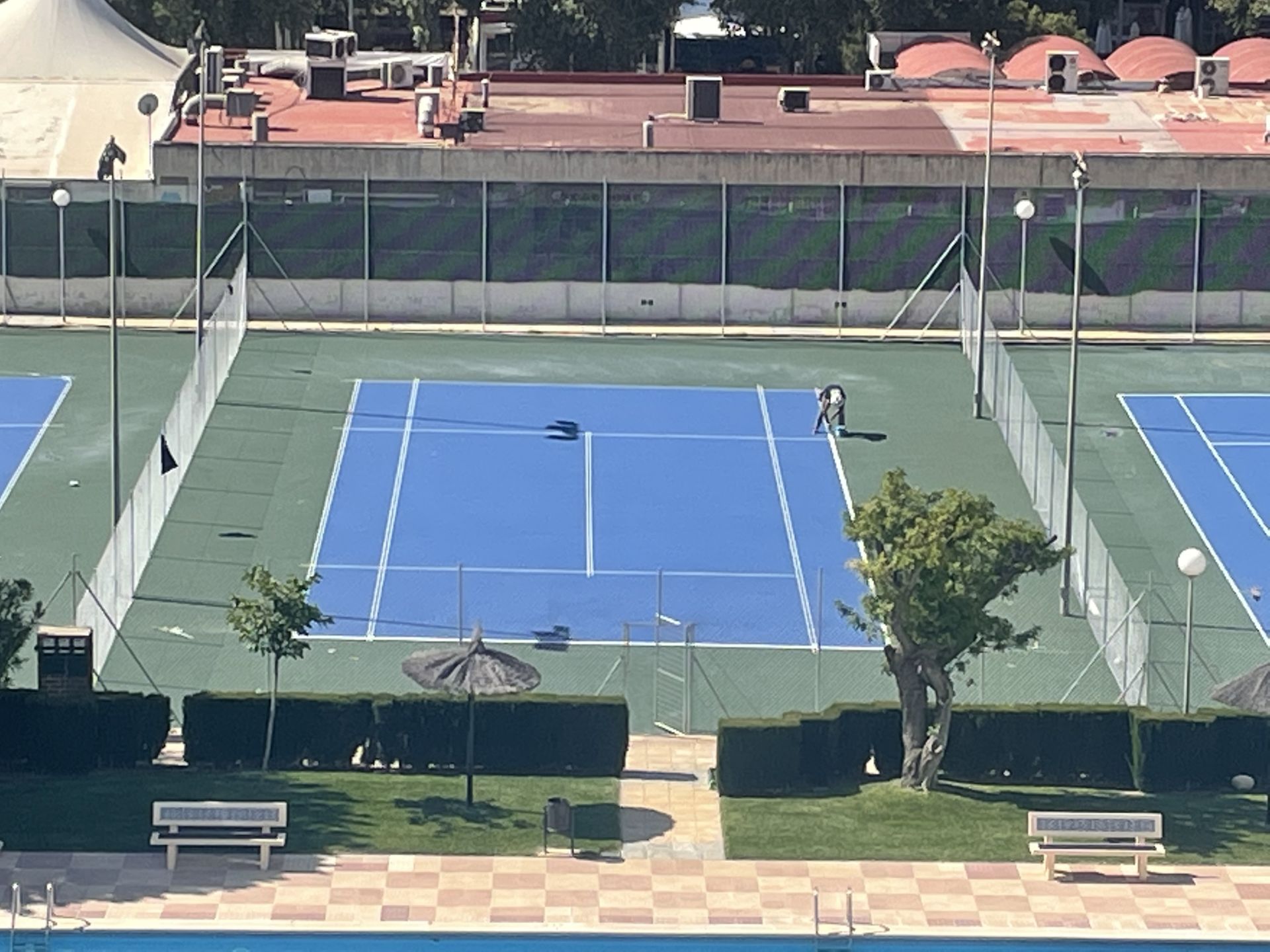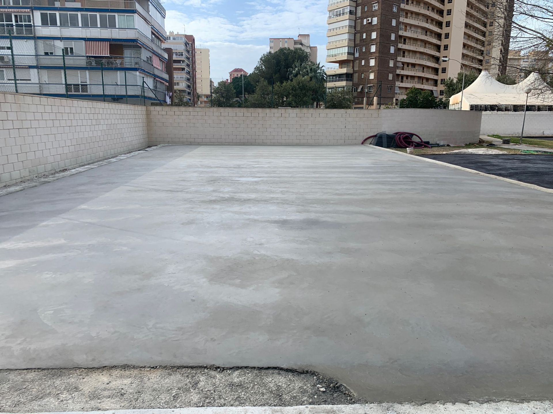 Se trata de 3 pistas llave en mano y se precedió a su completa demolición para posteriormente renovar el sistema de recogida de aguas pluviales, asfaltar la base con 2 capas de mezcla bituminosa en caliente sobre zahorras, sistema de resinas de 4 capas, equipamiento de tenis y vallado perimetral. La pista de pádel está montada sobre una nueva solera de hormigón, estructura lacada en verde, cristales templados de 10 mm, césped fibrilado de 10 mm de alta calidad y 8 focos led de bajo consumo.